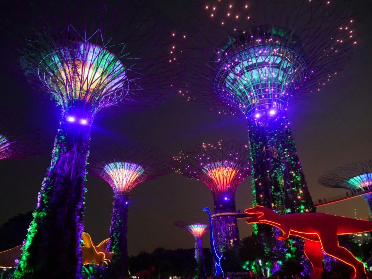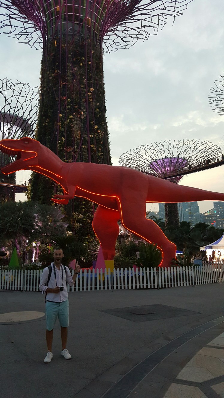 Watched the light show at Gardens by the Bay – they have 2 evening showings where they light up the Supertrees to music. It was very impressive! Even better for us was that during the time we where there, the gardens were lit up with giant dinosaurs which were part of a children’s festival. Ben is a massive dinosaur fan so perfect for him! (I think mom would have preferred them not to have been there, they did intrude on the scene slightly!)